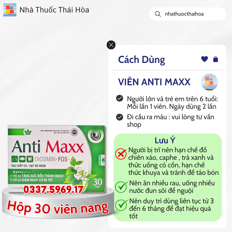 Anti Maxx hổ trợ giảm trĩ nội, trĩ ngoại , trĩ độ 1,2, đi cầu ra máu do trĩ. Tăng cường chất xơ ngăn ngừa táo bón . Tăng cường sức bền thành mạch