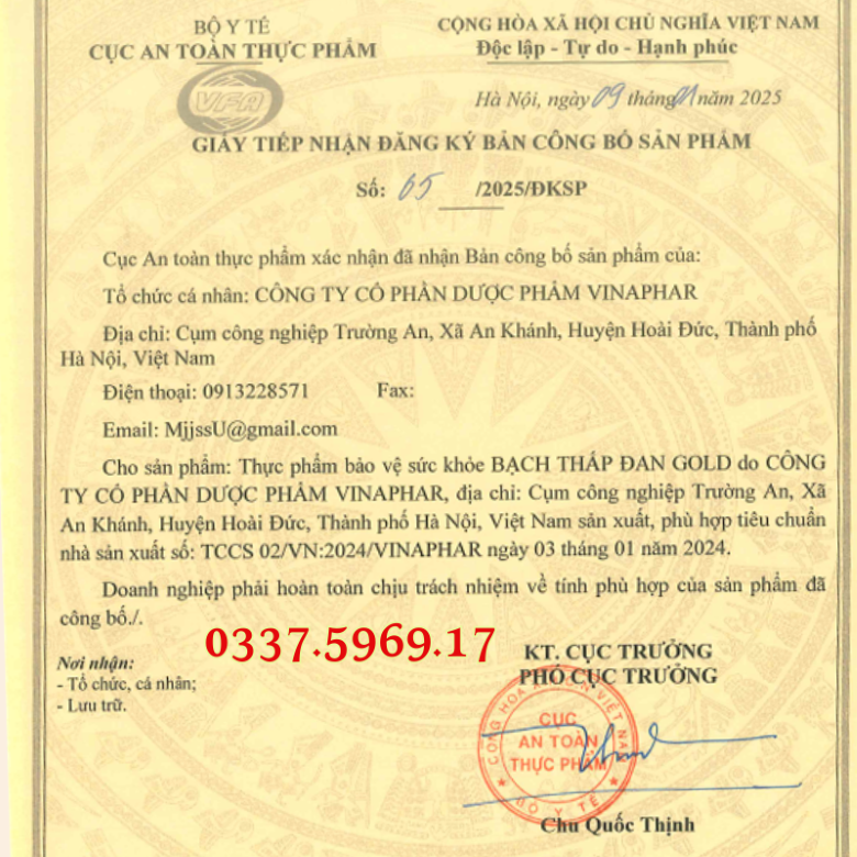 Thương nhân chịu trách nhiệm về chất lượng, sản xuất, công bố và phân phối: Công Ty Cổ Phần Dược Phẩm VinaPhar