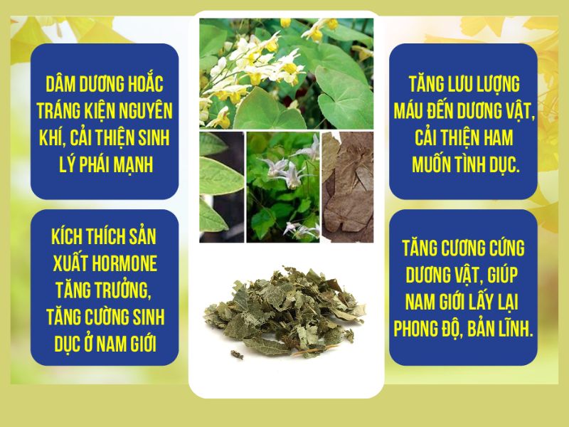 Dâm dương hoắc được biết đến như một "thần dược" tự nhiên cho các vấn đề về sinh lý. Hoạt chất icariin có khả năng kích thích sản sinh hormone testosterone, giúp nam giới cải thiện tình trạng rối loạn cương dương, xuất tinh sớm, hoặc giảm ham muốn.