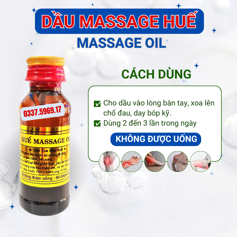 Dầu Xoa bóp Massage Huế là sản phẩm hội tụ của các loại tinh dầu dùng để xoa bóp massage, khi xoa bóp ban đầu sẽ có cảm giác hoàn toàn bình thường nhưng sau 5 đến 10 phút các tinh dầu phát huy tác dụng và mang lại cảm giác ấm áp dễ chịu.