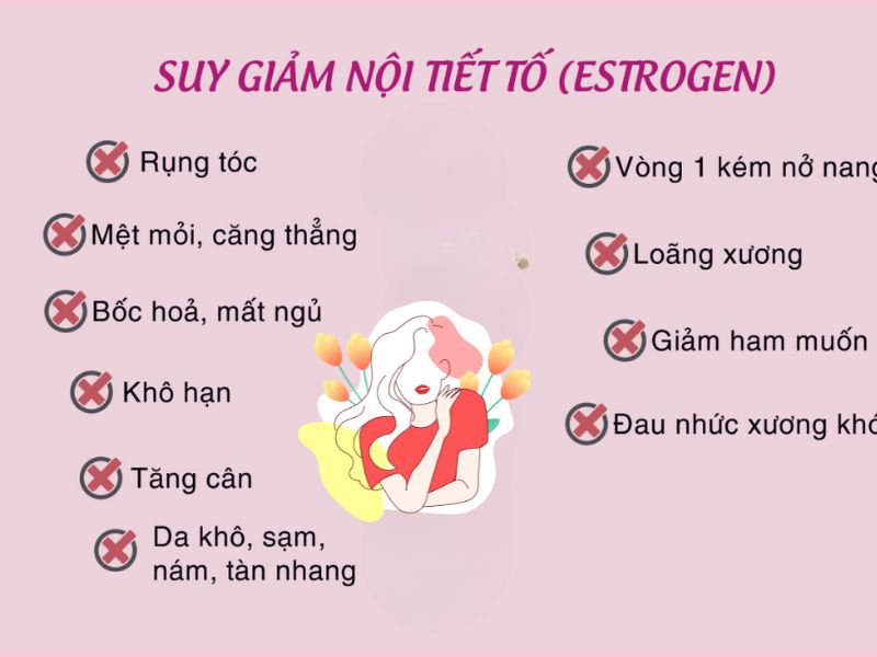 Estrogen thấp: Khô âm đạo, giảm ham muốn tình dục, rối loạn kinh nguyệt, loãng xương và các cơn bốc hỏa. Những triệu chứng này không chỉ ảnh hưởng đến sức khỏe mà còn làm giảm chất lượng cuộc sống hàng ngày.