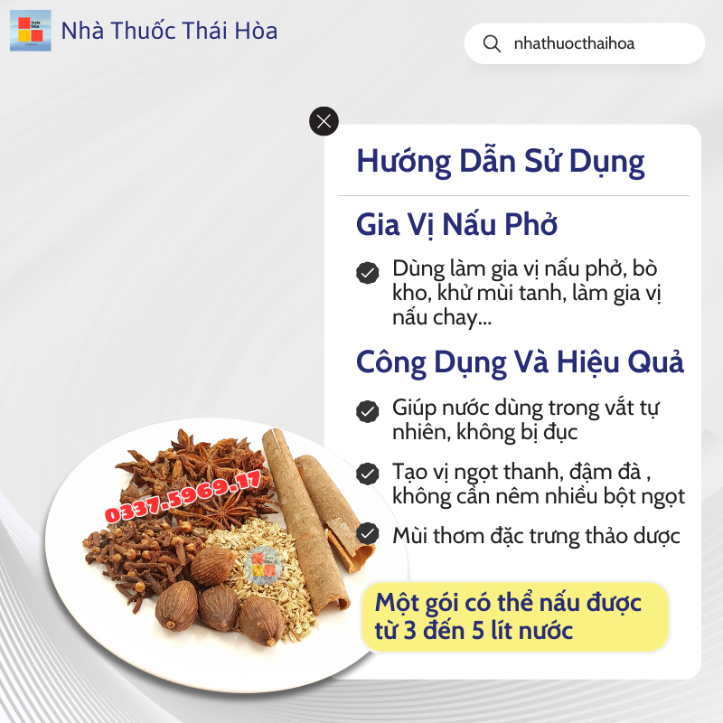 Thành phần: Quế, Hồi, Thảo Quả, Đinh Hương, Tiểu Hồi