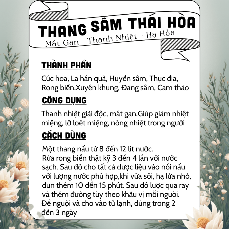 Gia vị nấu sâm Thái Hòa có nguồn gốc thảo dược như cúc hoa, rong biển, la hán quả, huyền sâm, thục địa.… luôn được ưa chuộng trong những ngày nắng nóng. Đặc biệt, có tác dụng thanh nhiệt, giải độc, giảm nhiệt miệng , lỡ loét miệng,sâm bông cúc không chỉ là thức uống bổ dưỡng mà còn có hương vị thơm ngon, rất dễ uống