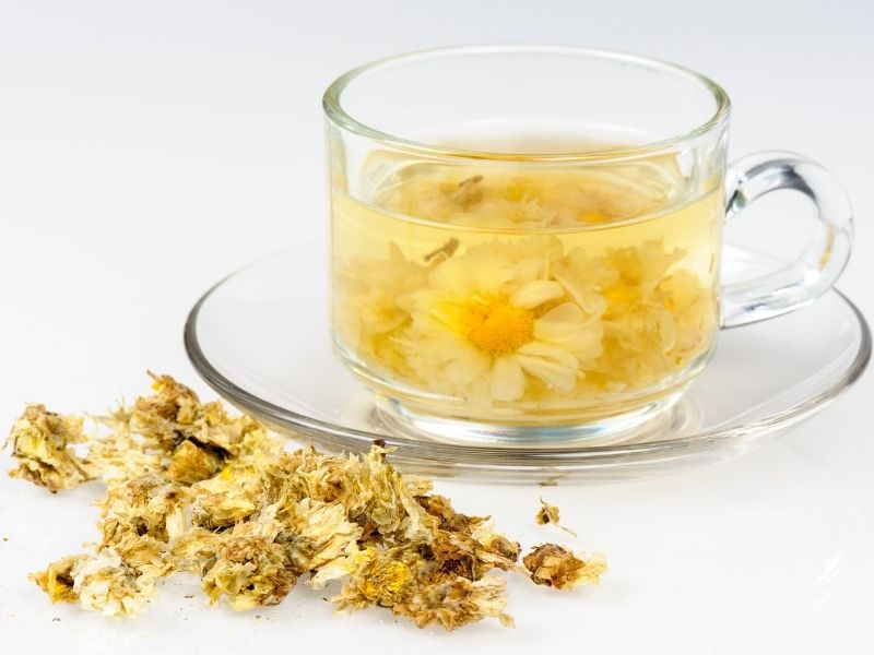 Pha trà: Hãm 2-3 bông hoa cúc khô với nước nóng trong 5-7 phút, có thể thêm mật ong để tăng hương vị. Uống trà hoa cúc ấm khoảng 1 giờ trước khi đi ngủ.